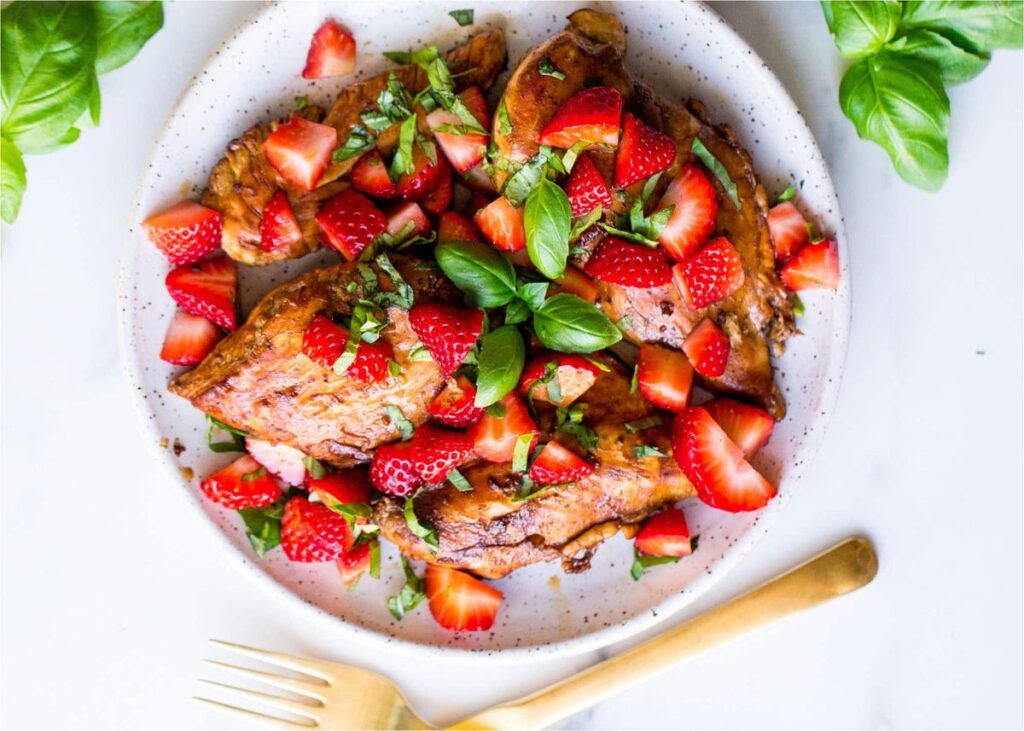 - Ingredients: Chicken breasts, fresh strawberries, red onion, cilantro, lime juice, and jalapeño.